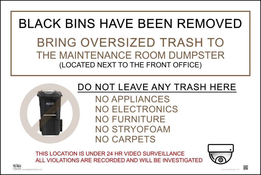 - Bring oversized, non-baggable trash to the Maintenance Room Dumpster (next to the Office) – NO MORE BLACK BINS.